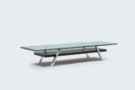 19mm helder glas, hoeken afgerond R=2mm, aluminium gepolijste poten (30x30mm) en een gelakt of gefineerd onderblad (40mm). Tevens verkrijgbaar met een glazen onderblad. Aan de salontafel B1 zitten geen bevestigingsmaterialen en aan dit model wordt niet gelijmd.