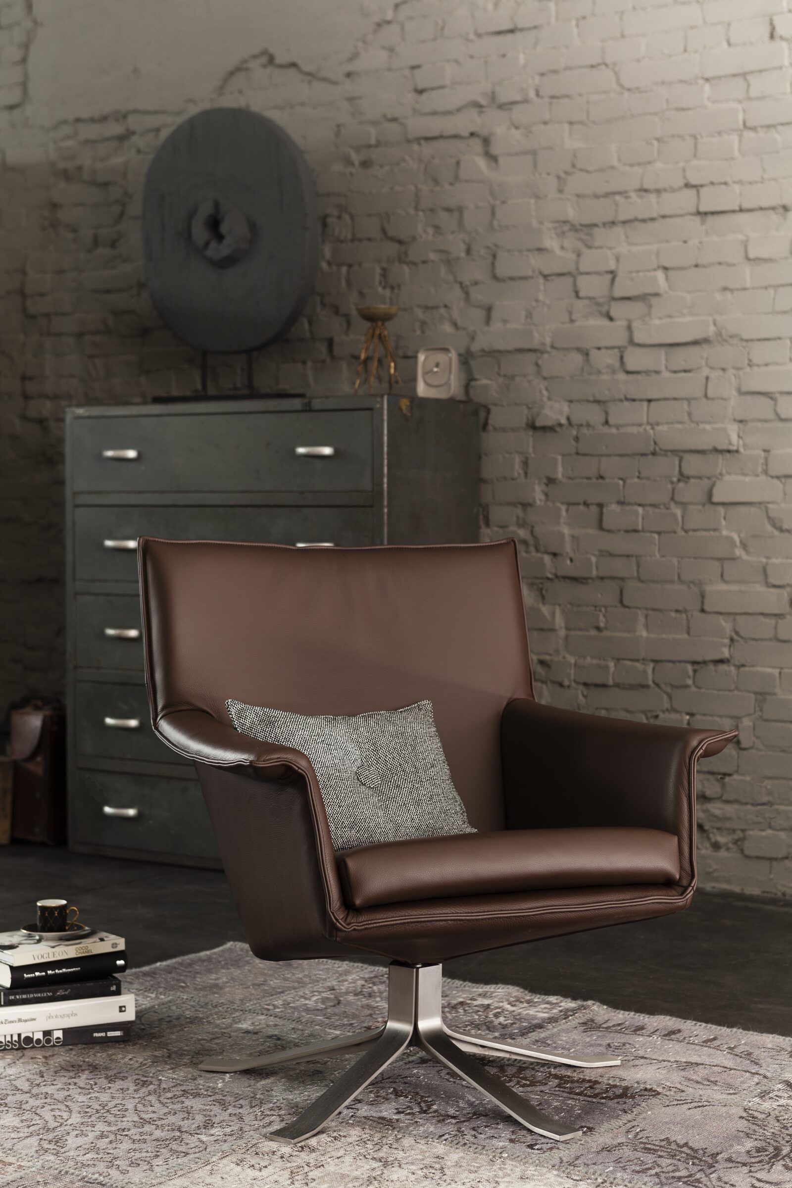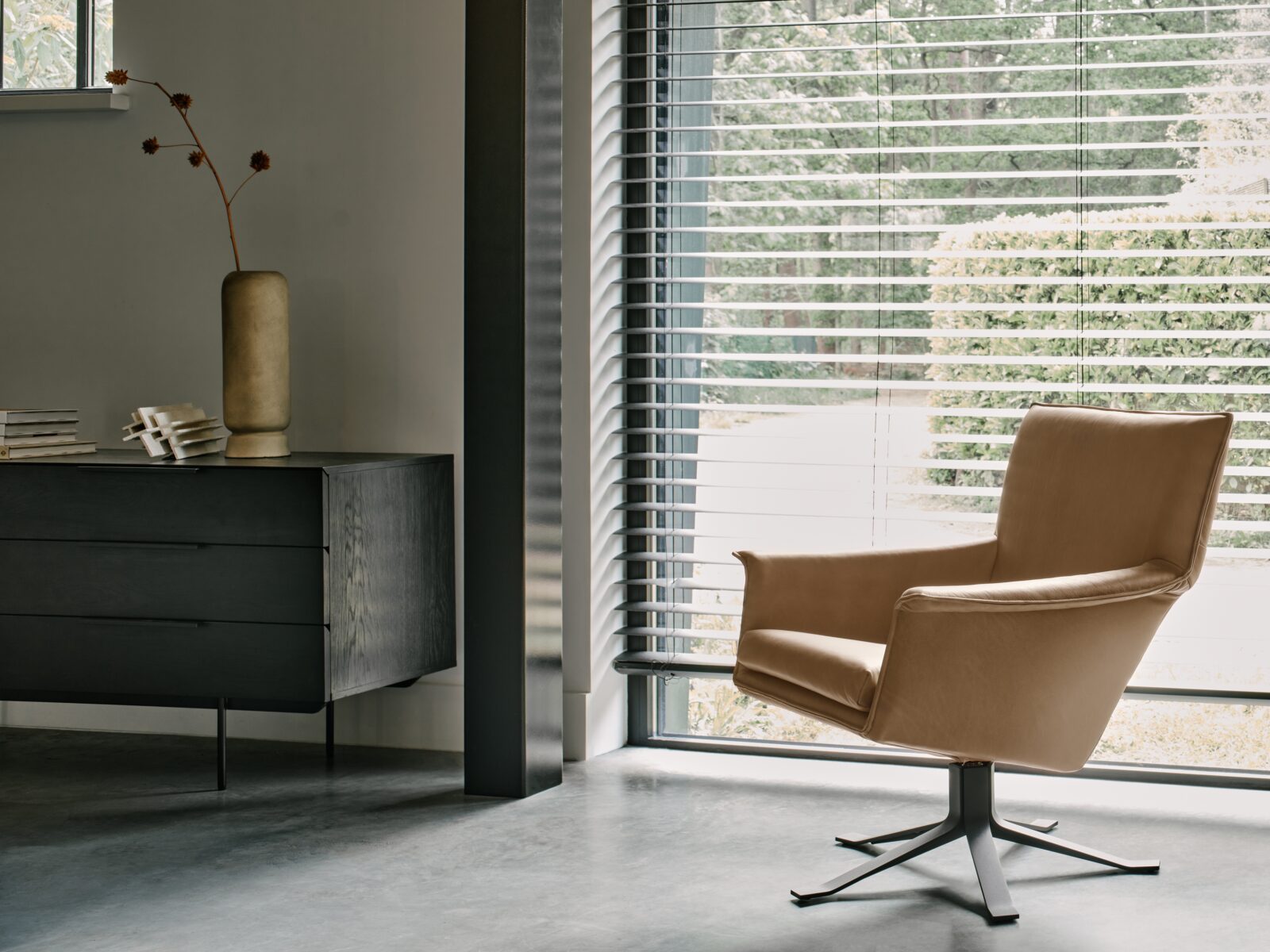 Djenné maakt het nog eenvoudiger om de zithoek in te richten. De fauteuil kan op praktisch elke plek in de woonkamer geplaatst worden, doordat hij met één beweging richting de bank of bijvoorbeeld de tv gedraaid kan worden. Djenné’s ranke uiterlijk wordt geaccentueerd door de doorlopende belijning aan de voorzijde. Een mooi detail is de voet, die door het platte uiteinde één lijkt te worden met de vloer.