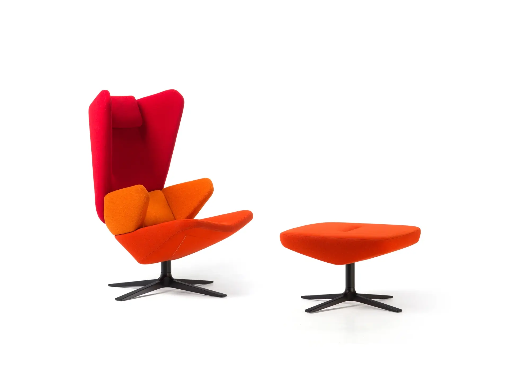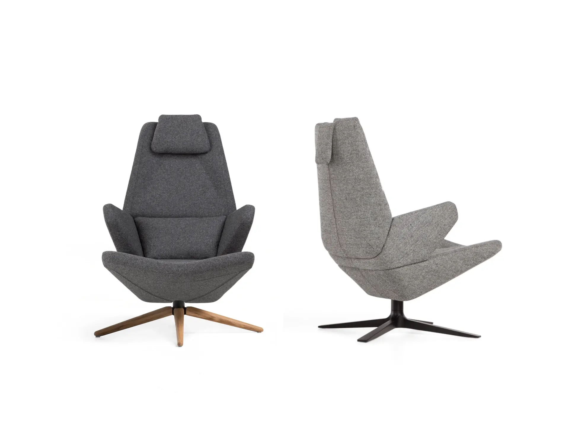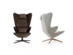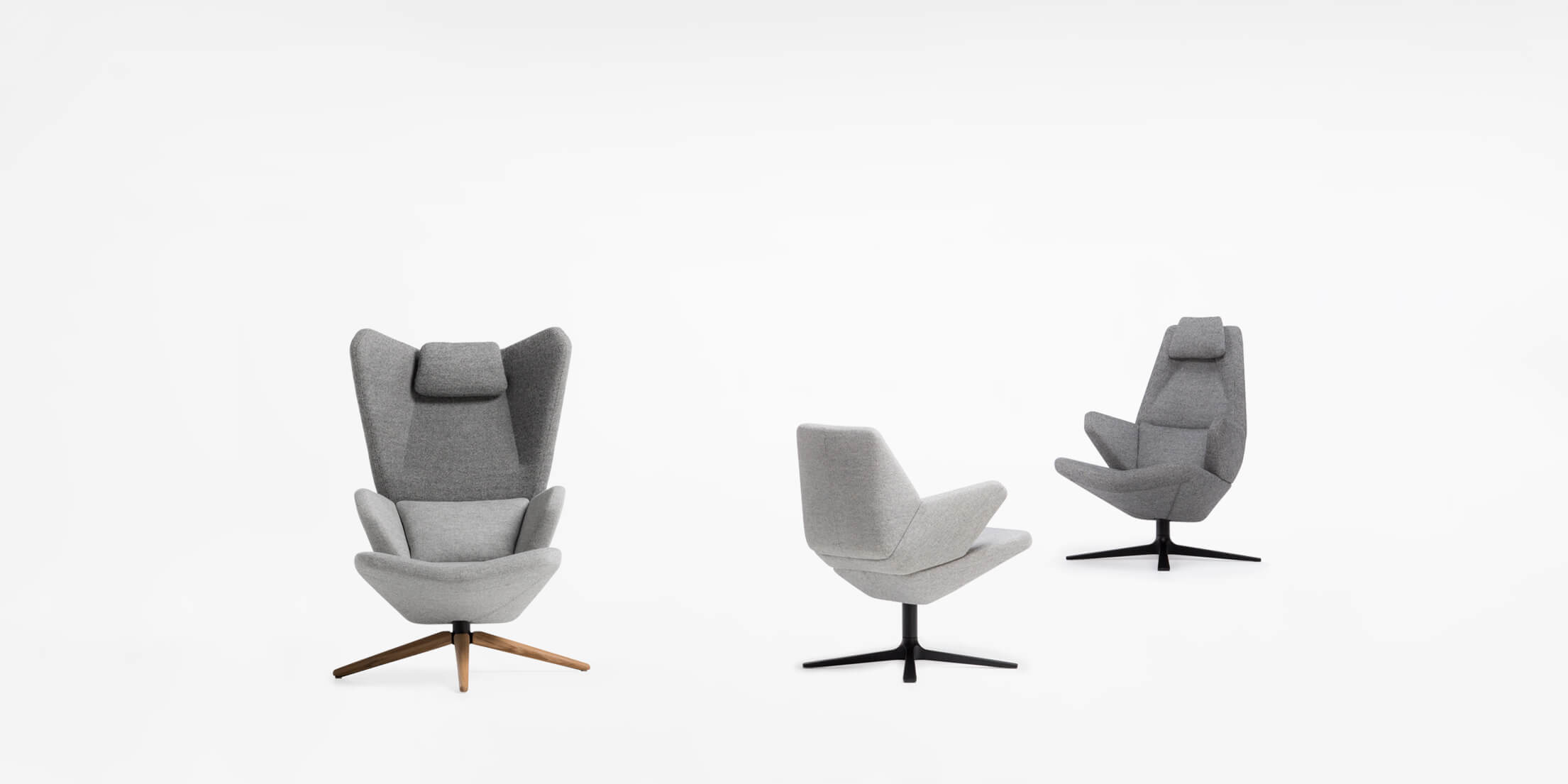Trifidæ are a family of seats consisting of three different armchairs, deriving from a single typological and formal origin. Consisting of three separate parts, the small easy chair, high backrest armchair and the enclosing lounge chair share the same triangulated form with the focal point in the central part, embracing the user’s lumbar area and functioning as an armrest. The tilting of the three parts of the armchairs resembles closing and openings of the petals of flower buds. Regardless to the fact that the easy chair differs in size and form from the others, while the armchair and the lounge chair share the same base and the armrest, all three are perceived as neighbouring elements in progressive series. The alternation of the backrest of two bigger chairs results in different characters of the objects. Application of the enclosing backrest provides an introverted, expressive chair, protecting it’s user from his/her surrounding, while the use of the slim, high backrest ends up in an open, extrovert personality and usage of the chair.
